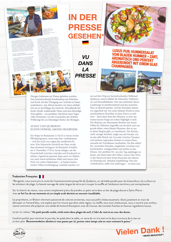 Le Beach Bar Quiberon est une entreprise familiale. Lancé à l’été 2014 dans un cadre unique et atypique à deux pas de la plage et du Fort de Penthièvre, offrant un panorama magique à l’heure du couché du soleil. Un bar aux cocktails de qualités aux alcools selectionnés, un restaurant de plage sans prétention, une cuisine simple, aux saveurs bretonnes et d’ailleurs offrant à n’importe quelles heures des saveurs à partager. Les producteurs locaux s’invitent également dans votre assiette avec nos partenaires gustatifs de Quiberon et la Region. Également son terrain de Beach Volley accessible du matin jusqu’au soir qui amusera les petits commes les grands. Le Beach Bar propose aussi un magasin de textile, de produits locaux et de souvenirs de la Bretagne qui feront plaisir à tous.